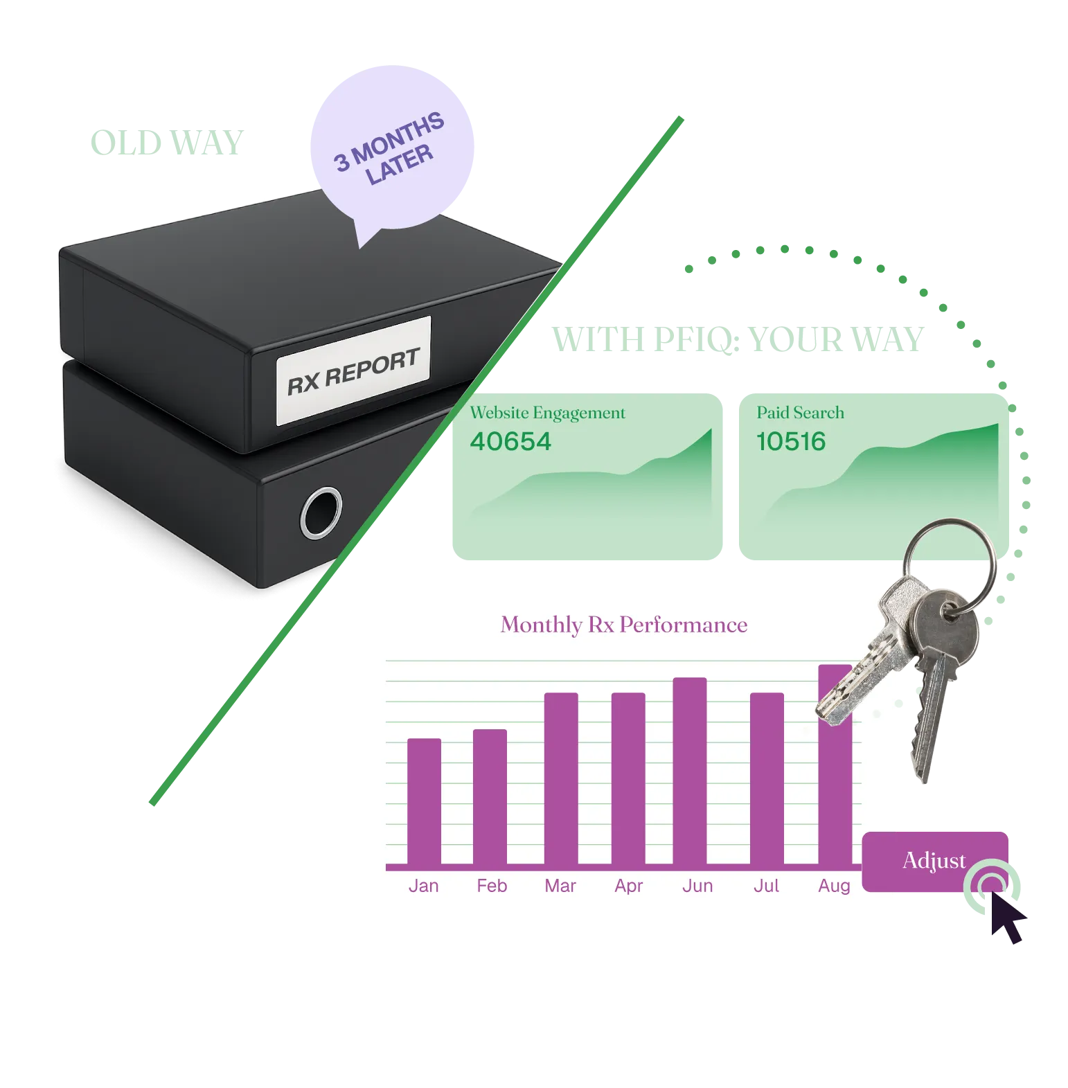 Waiting months on results is the old playbook. Our insights refresh dynamically—giving you continuous optimization opportunities. We show live dashboards, including website, paid media, paid search, and CRM opt-in metrics. And patient keys connect back to our identity graph in a privacy-safe, compliant way to measure script lift rapidly.